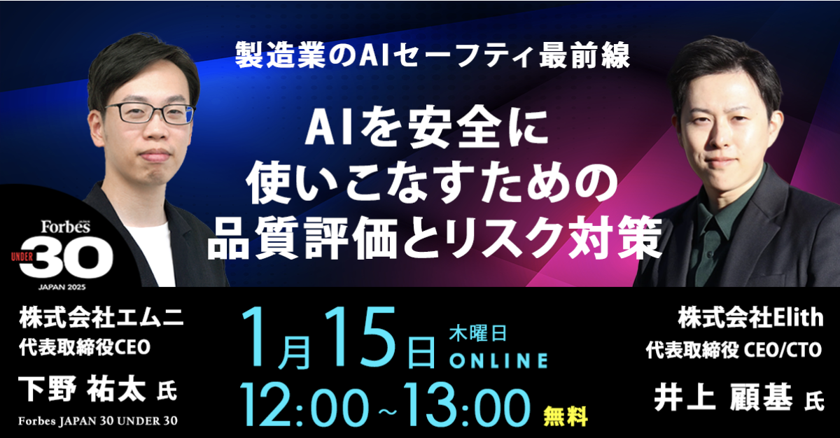 2026年1月15日(木)、 株式会社エムニ(本社:東京都、代表取締役:下野祐太、以下「エムニ」)主催で株式会社Elith 代表取締役 井上 顧基 様をお招きし、無料オンラインセミナーを開催いたします。生成AIの評価・安全性、実務利用における課題と対応策について、経営陣によるクロストークを通じて深掘りする、貴重なセミナーとなっております。